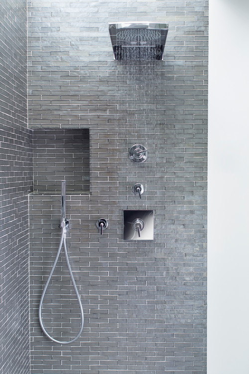 I tried extremely hard to take pictures of our newly renovated bathrooms but it was just not working out how I had anticipated. Since I wanted to share a peak into our new favorite rooms, I took to Houzz to see if I could find images that represent aspects of our new bathroom. The master bath is really the star of the show as we completely gutted and updated it. Our second bathroom, although very nice, had a few changes such as a new vanity, sink and toilet to freshen the space up. The master bathroom floor and shower tile is similar in color to the first image but is laid straight instead of in a herringbone pattern. We have the most amazing rainfall shower head that makes you want to take longer showers than needed. Much to my delight, our vanity is white and we have modern light grey countertops with under-mounted square sinks and chrome fixtures in both bathrooms.